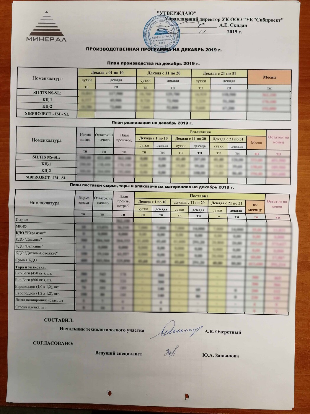 Организация ритмичной работы цехов в изготовлении деталей, сборочных узлов и единиц (горно-проходческого оборудования), движении продукции по цехам, планирование, отгрузка в установленные сроки готовой продукции и изделий, выпускаемых заводом. Осуществления контроля по обеспечению производств материальными ресурсами, рациональному использованию материалов в подразделениях завода. Проведение инвентаризации. Ведение отчетной документации.